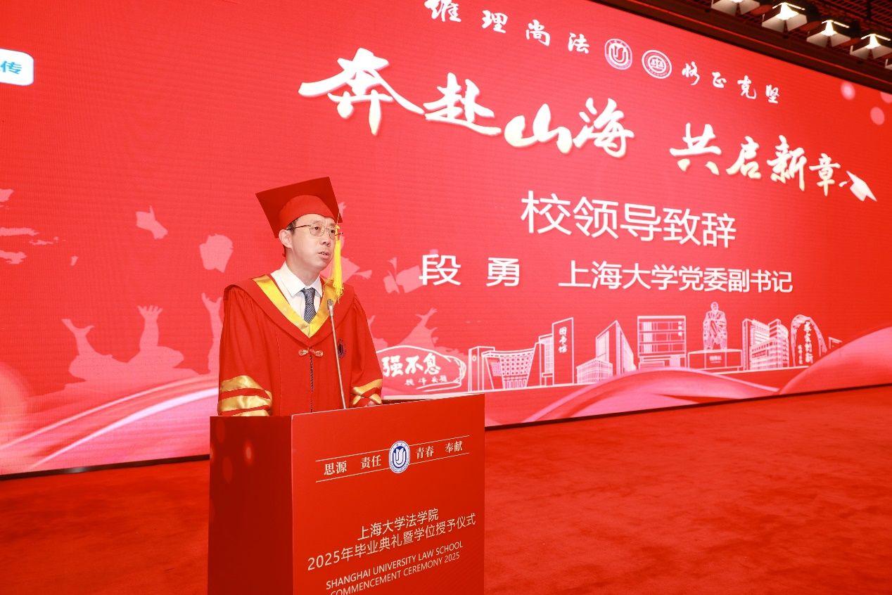 sunbet申搏官方网站党委副书记段勇教授为全体毕业生送上诚挚祝福与殷切嘱托,鼓励同学们在面对复杂社会环境与就业形势时保持积极的态度,通过这三句充满哲理的箴言,鼓励大家以开放心态、全面认知和人格平等的理念迈向未来,保持扎实与自信:“古今一也,人与我同耳”,寄语同学们学会换位思考,更好地认识自己与他人;“兼听则明,偏信则暗”,警醒大家要有意识地从不同渠道获取信息,保持全面的认知,避免陷入信息茧房;“己所不欲,勿施于人”,希望大家在今后的生活、工作中尊重他人,以真诚和善良对待。最后,段书记以于右任老校长与钱伟长老校长的“大任于斯,江山有待;伟业流长,自强不息”寄语全体毕业生,激励大家坚守信念,勇敢追梦。并衷心祝愿同学们前程似锦,未来可期!