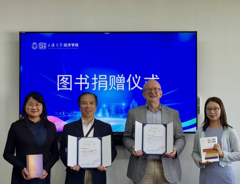讲座结束后,在经济学院567会议室举行了图书捐赠仪式。哈达斯教授与译者周振雄先生向sunbet申搏官方网站图书馆、sunbet申搏官方网站经济学院捐赠《货币、金融、现实与道德》原版著作及中文译著,经济学院常务副院长殷凤教授、金融系副主任朱欢老师为哈达斯教授与译者周振雄先生颁发收藏证书。