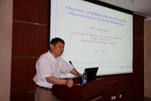 6月5日上午,卢毅成教授作了题为“Multifunctional ZnO and Its Nanostructures for Novel Biosensors”的学术报告。卢教授详细介绍了当今ZnO领域国际研究现状及热点方向,特别是基于多功能纳米ZnO材料的生物传感器的研究,并展示了他带领的研究组在ZnO功能材料和器件方面开展的工作和取得的成果。在座的老师、同学都感到深受启发。