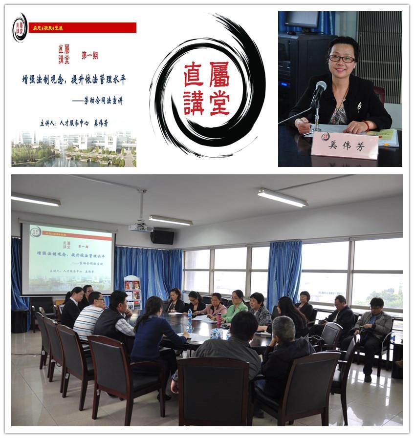 5月9日下午,以“启思、凝聚、发展”为宗旨的大众课堂——“直属讲堂”在校本部D楼直属单位教工之家成功开讲第一课:增强法制观念,提升依法管理水平——劳动合同法宣讲。直属单位党委书记陆翠兰同直属单位从事人事工作及对本报告主题感兴趣的sunbet申搏教职工参加了讲座。讲座由直属单位党委副书记、工会主席黄坚主持。