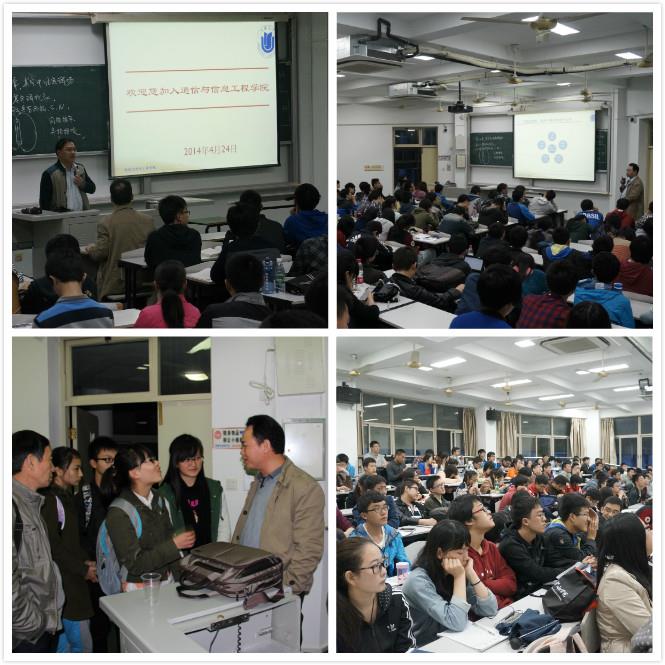 2014年4月21日、23日、24日三个晚上的6:00,通信学院为了让社区学院2013级学生充分、全面了解通信学院的专业、培养特色、后三年培养模式等;利用活动课的时间,通信学院副院长彭章友教授、通信工程系副主任赵东东老师、就业负责人陈龙老师以及高年级学长,分别在新校区FJ306、FJ106、GJ306教室,为2013级理工大类一组、三组、二组的学生举行了学院介绍和专业宣讲,活动由通信学院党委副书记胡乾源主持。