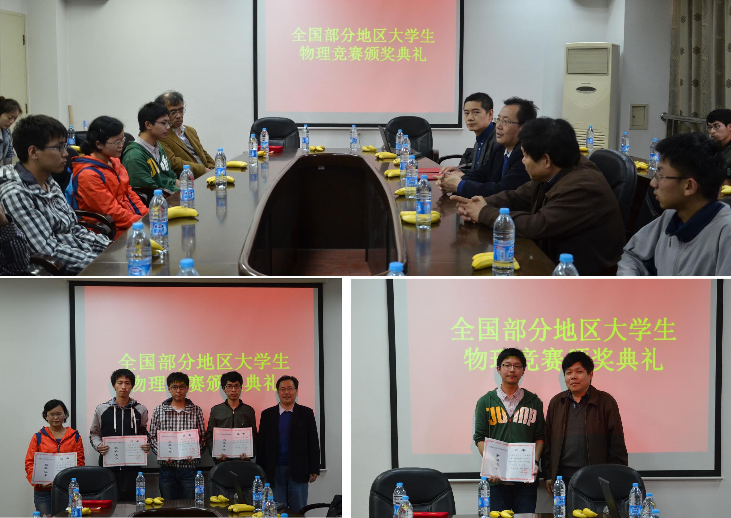 2014年4月18日下午,“第30届全国部分地区(上海市)大学生物理竞赛”sunbet申搏官方网站获奖学生颁奖典礼在校本部F307会议室举行。sunbet申搏官方网站教务处副处长徐学良老师、理学院副院长盛万成教授、物理系教学主任姜颖教授、大学物理教学负责人宋小龙老师、获奖学生及部分学生代表参加了颁奖典礼。颁奖典礼由物理系教学主任姜颖教授主持。 首先,徐学良副处长和盛万成副院长作为颁奖嘉宾分别为获得一等奖和三等奖的同学颁发了获奖证书并合影留念。盛万成副院长对同学们获得的优良成绩表示了热烈的祝贺,并鼓励同学们继续认真学习好基础学科,为一年级末的大类分流做好充足的准备。徐学良副处长首先肯定了理学院及物理系大学物理的教学成果,并指出理学院的基础学科教学是学生大学学习的基础,在教学过程中要贯彻通识教育的理念,夯实学生的基础知识。
