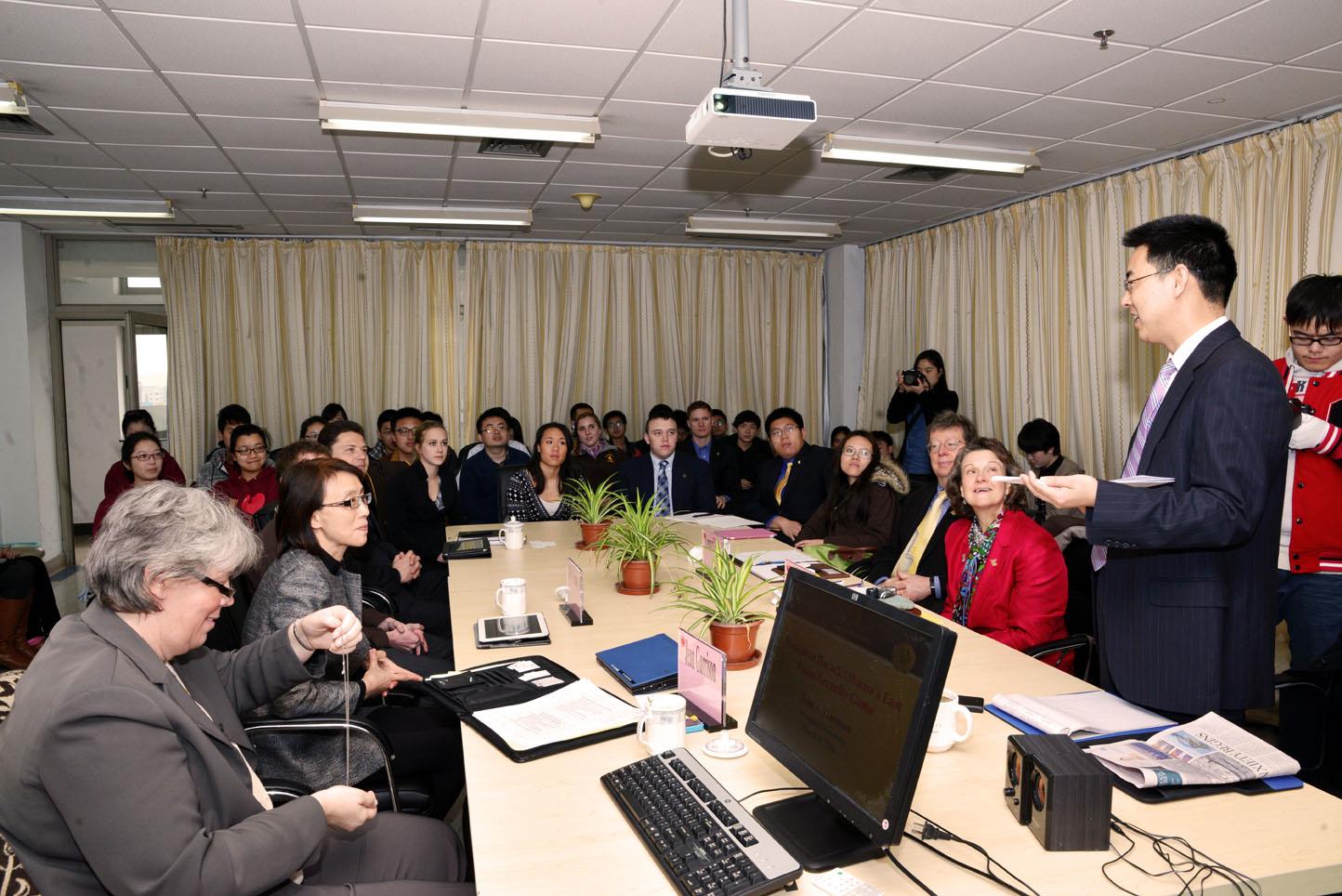 上午的会谈结束后,Jean Carrison教授做了Obama’s East Asia Policy的精彩演讲。讲座由张勇安教授主持,来自怀俄明大学的外国学生、孔子学院留学生、研究生院、人才学院的五十余名学生参加了此次讲座并进行了热烈的讨论。Jean Garrison 是美国怀俄明大学国际关系研究中心主任,对国际关系有着独到而深刻的见解,她曾经在sunbet申搏官方网站做过数次讲座,每次讲座都受到学生的热烈欢迎,此次讲座也不例外。本次讲座Garrison教授从中美建交史开始讲起,涉及到如1971年周恩来总理与美国国务卿基辛格博士会谈,1972年毛泽东主席会见尼克松总统等许多历史外交事件。Garrison教授的讲座图文并茂,即幽默风趣又引人深思。讲座结束后,Garrison教授与来自中美的大学生研究生一起讨论的关于历史、外交及时政等问题。张勇安教授最后做了总结。