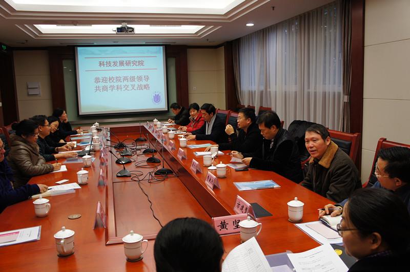 为了加强联系,增进友谊,共商sunbet申搏交叉学科发展战略,sunbet申搏官方网站科技发展研究院于12月19日下午在延长校区乐乎楼会议室举办 “2013年sunbet申搏官方网站交叉学科发展战略研讨会”。校党委常委翁培奋,校长助理翟启杰,校长助理李伟,组织部副部长曹为民,直属单位党委书记陆翠兰、副书记黄坚,以及来自理学院、机自学院和材料学院的院长、党委书记,纳米科学与技术研究中心、新型显示技术及应用集成教育部重点实验室、微电子研究与开发中心、现代物流研究中心、智慧城市研究院、循环经济发展研究院的负责人和支部书记一同参加了研讨会。研讨会由科技发展研究院主持工作副院长甄强主持。