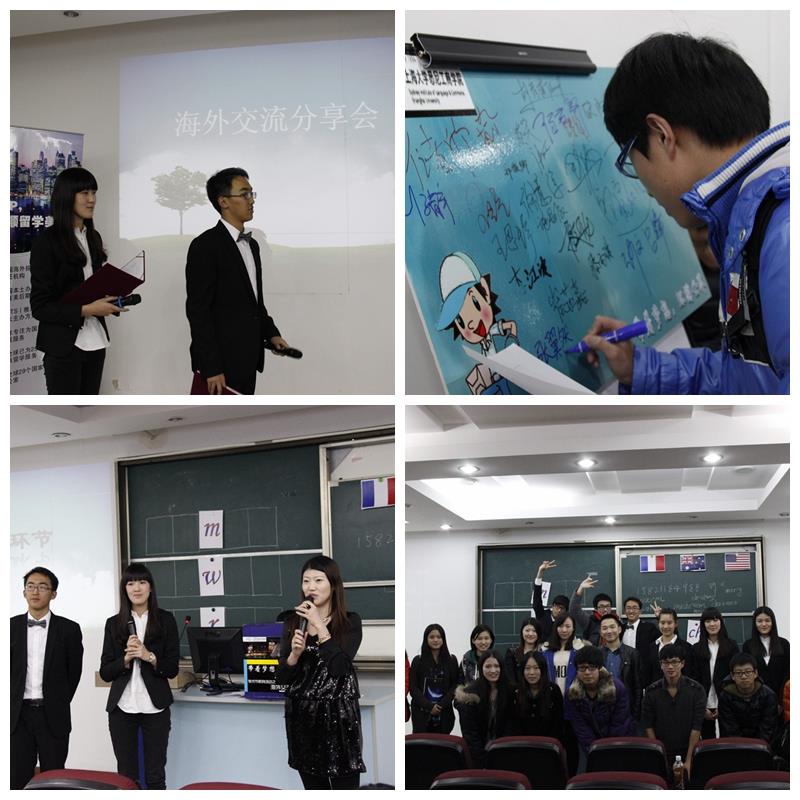 在交流会上,首先由澳洲交流回国学生卢莹简单介绍了澳洲UTS的课程情况及留学期间学习和沟通的经验和技巧。她结合自身的感悟,告诉大家不要害怕迷路,在迷路中才能发现问题,进而解决问题,才能发现更美的风景。随后,美国留学归来的沙文和法国留学归来的蒋婷婷,则分别结合自己的交流学习经历,分享了自己在美国和欧洲留学经验,在留学中遇到的各类问题的解决方法,又介绍了自己在旅游和派对中的趣事和当地的一些特色文化及风土人情。她们告诉在座的低年级学生,要把目光放长远,长期规划自己大学生活以及未来的发展。