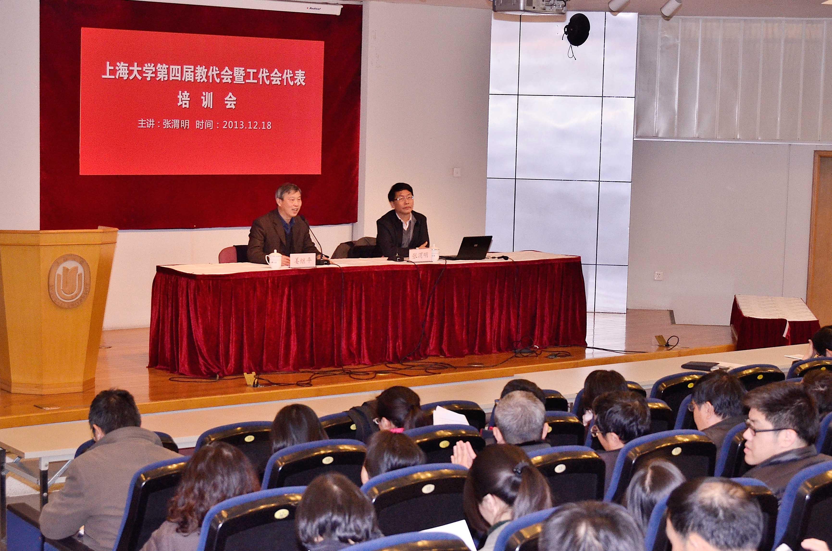 短短的一个半小时内,张渭明教授根据《上海市职工代表大会条例》和教育部《学校教职工代表大会规定》精神,围绕教代会的性质、职权、组织制度、议事规则和教职工代表履职等五个方面,结合上海市教育系统教代会实例,向各位代表作了详细解读与深刻阐释。张渭明指出,教代会是教职工依法参与学校民主管理和民主监督的基本形式,是校务公开的基本载体,是高校管理体制和现代大学制度的重要组成部分,是充分反映民意和集中民智的重要形式。代表要不断增强定位意识、责任意识、桥梁意识、大局意识和双赢意识,提高提案的能力和审议的能力,不负广大教职工的嘱托。