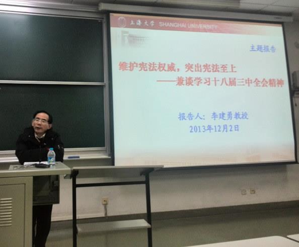 首先,李建勇教授通过分析比较十一届三中全会和十八届三中全会的历史背景和特点,总结了改革开放以来的社会巨变以及对未来的展望。其次,李教授又从七个方面对中国宪法和法治之路的过程作了评价,并且由历史发展的角度分析了中国实施法治的社会土壤。然后,李教授为大家解读了十八届三中全会决定中与宪法相关的第八—十部分内容,重点解读了第九部分中关于建设法治中国,必须坚持依法治国、依法执政、依法行政共同推进,坚持法治国家、法治政府、法治社会一体建设的论述。最后,李教授由习近平总书记所说的“宪法的生命在于实施,宪法的权威也在于实施”,总结出维护宪法权威就必须突出宪法至上的论点。
