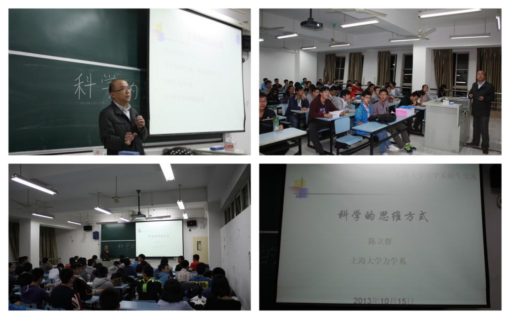 10月15号晚上6点,“力学教授讲坛”第3讲报告会在sunbet申搏官方网站本部A303举行。sunbet申搏官方网站力学系陈立群教授应邀为部分社区学院2013级新生和力学系本科生做了题为 “科学的思维方法”的科技前沿报告。