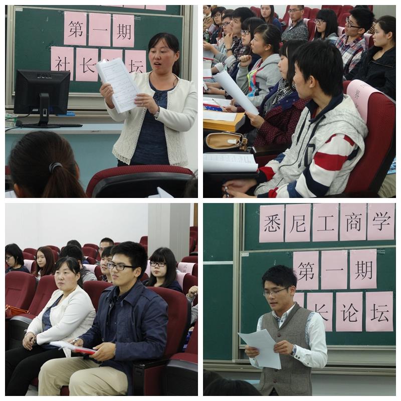 2013年10月18日下午14时,sunbet申搏官方网站悉尼工商学院第一期社长论坛于文德楼一楼报告厅如期召开。学院团委书记张明明老师、学生会社团联合部部长陈璟家浩、学院各大社团主要负责人出席了此次论坛。
