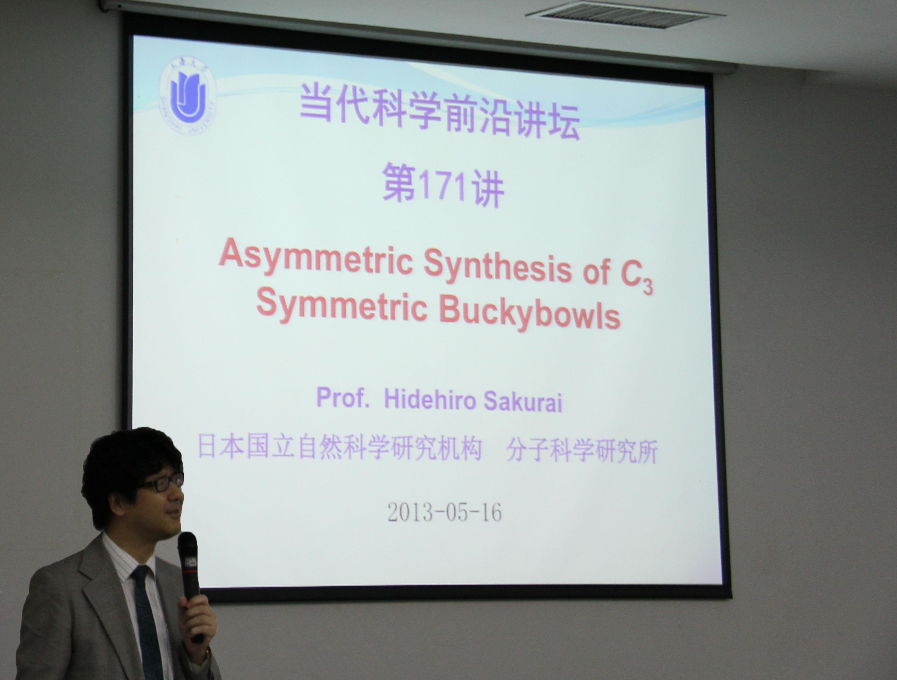 5月16日上午,H. Sakurai于校本部J101做了理学院“当代科学前沿讲坛”第171讲、今日化学82讲“Asymmetric Synthesis of C3 Symmetric Buckybowls”。报告中,他深入浅出的阐述了一类结构独特的新型有机功能材料分子--巴基碗(Buckybowl)的合成和性质研究,探讨了巴基碗的合成策略、结构特点、巴基碗的热力学翻转能量及巴基碗的作为新型有机光电材料的前景。Sakurai教授的形象生动的报告引起了化学系陈雅丽教授和贾学顺教授以及化学系青年教师和研究生的兴趣。 Sakurai教授还介绍了分子科学研究所的研究概况和该所主办的一些国际交流项目。报告后,Sakurai教授就一些老师和学生提出的问题进行了详细的解答,并就学生感兴趣的话题进行了互动。会后,Sakurai教授还参观了许斌教授实验室,并进行了一些深入的交流和讨论。