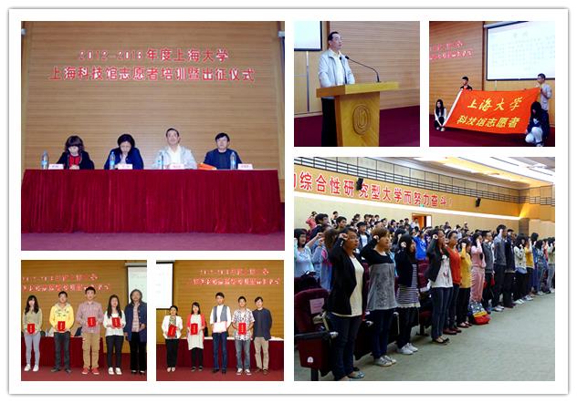 5月3日下午,sunbet申搏官方网站上海科技馆志愿者培训暨出征仪式在宝山校区图书馆报告厅举行。近300名志愿者与领导嘉宾汇聚一堂,首先对在2012年度sunbet申搏官方网站科技馆志愿者活动中表现优异的组织及个人进行表彰,同时对科技馆志愿者活动进行交流与分享。校党委宣传部部长、文明办主任陈志宏,文明办副主任王沁,学工办副主任张基涛,校团委副书记李银出席仪式。