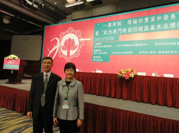 2013年3月26-27日,“‘一国两制’理论的丰富和发展学术研讨会暨纪念澳门特别行政区基本法颁布二十周年活动电视特辑精华片段”首播仪式在澳门旅游塔会展中心隆重举行。本次研讨会由澳门基本法推广协会、北京大学港澳台法律研究中心等单位联合举办。澳门特区行政长官崔世安、前全国人大常委会副委员长及原澳门特别行政区基本法起草委员会副主任王汉斌、全国大常委会法制工作委员会主任李适时、国务院港澳台事务办公室副主任周波、中联办副主任徐泽、外交部驻澳门特派员胡正耀、澳门立法会主席刘焯华、澳门基本法推广协会会长廖泽云、澳门基本法推广协会理事長崔世昌等领导出席了会议。原澳门基本法起草委员会内地委员、原澳门特区筹委会委员以及内地有关部门主管人员、两岸四地的学者共100多人参加了会议。澳门特区行政长官崔世安、全国大常委会法制工作委员会主任李适时、国务院港澳台事务办公室副主任周波、中联办副主任徐泽等领导等作为主礼嘉宾致词。