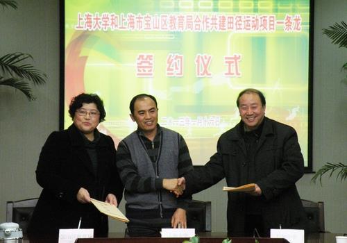 随后,张晓静局长、邵斌院长、张步华校长分别代表宝山教育局、sunbet申搏官方网站体育学院和行知中学签署了“行知田径运动项目一条龙”协议。