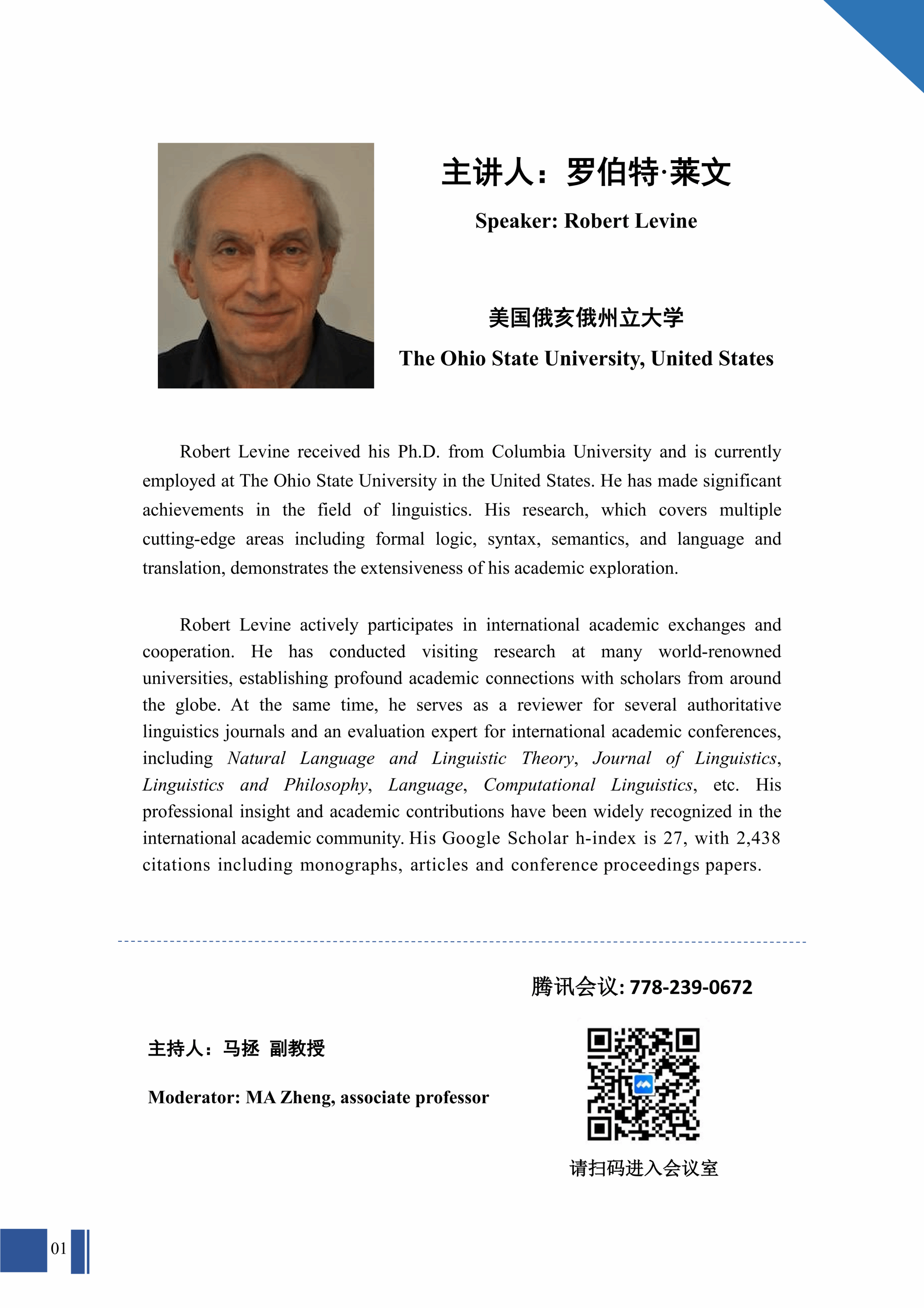 sunbet申搏官方网站外国专家大讲堂:美国俄亥俄州立大学Robert Levine教授专题系列讲座
