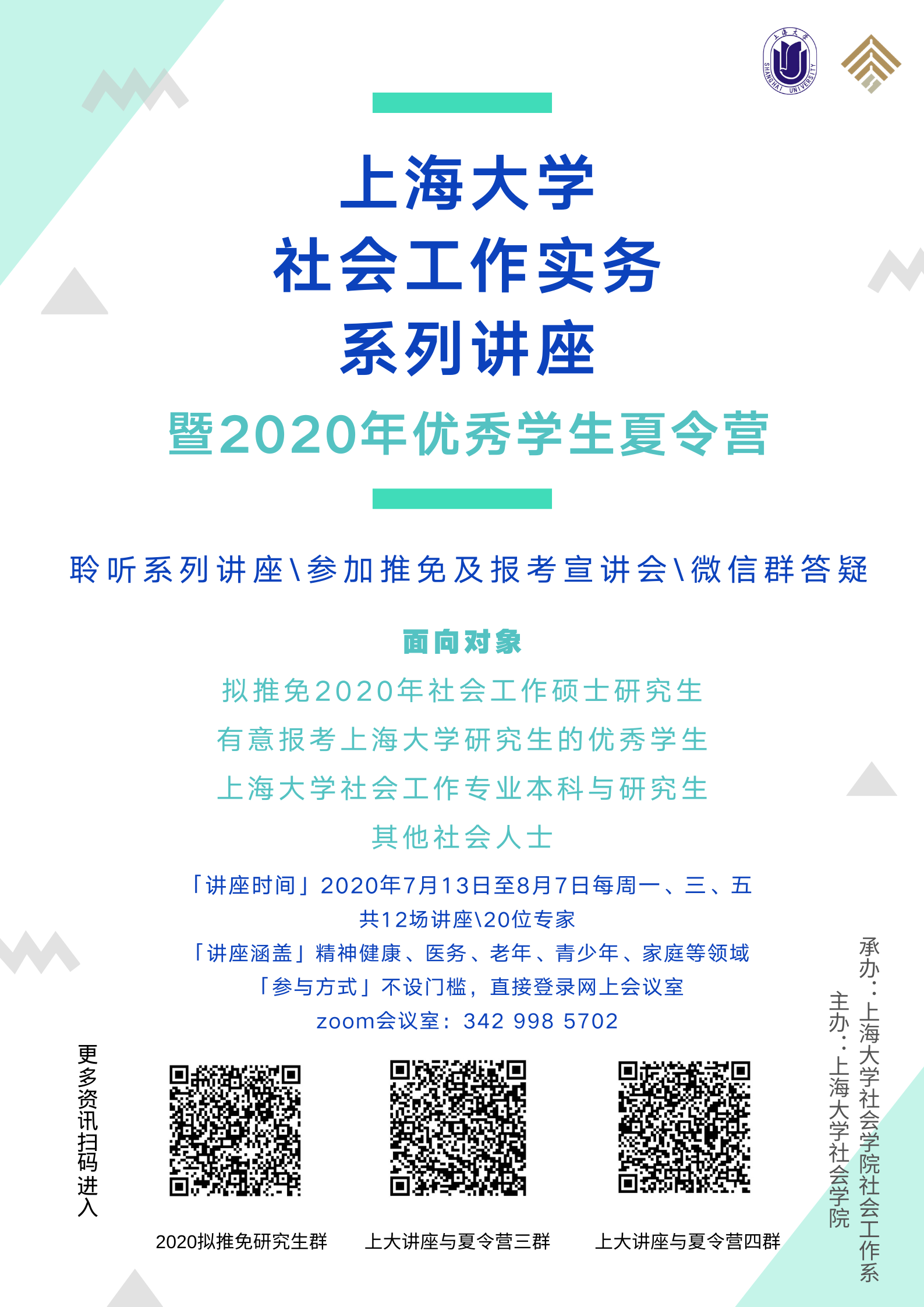 sunbet申搏官方网站社会学院将于2020年7月13日至8月7日期间于线上会议平台举办“sunbet申搏官方网站社会工作实务系列讲座暨优秀学生夏令营”。本次活动旨在搭建青年学子与社会工作专家学者和一线实务工作者的交流平台,增进青年学子对社会工作专业的了解,拓宽学术视野,激发科研兴趣。系列讲座共有12场,自7月13日开始,每周一、三、五定期推出,持续四周。每场讲座有1-3位演讲专家,中国台湾,以及美国、英国等20余位专家学者参与本次系列讲座,内容涵盖精神健康、医务、老年、青少年、家庭等社会工作的多个实务领域。系列讲座同步推出2020年sunbet申搏官方网站社会工作专业推荐免试研究生及优秀社会工作大学生学术夏令营,将为有意推免或报考sunbet申搏官方网站研究生的同学们提供学术讲座、推免咨询、专场宣讲等活动。